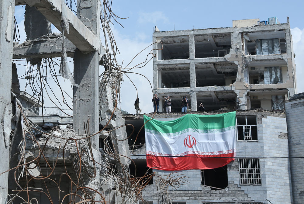 4月20日,在伊朗首都德黑兰,伊朗国旗悬挂在遭美以空袭严重损毁的居民区建筑物上。新华社记者 沙达提 摄